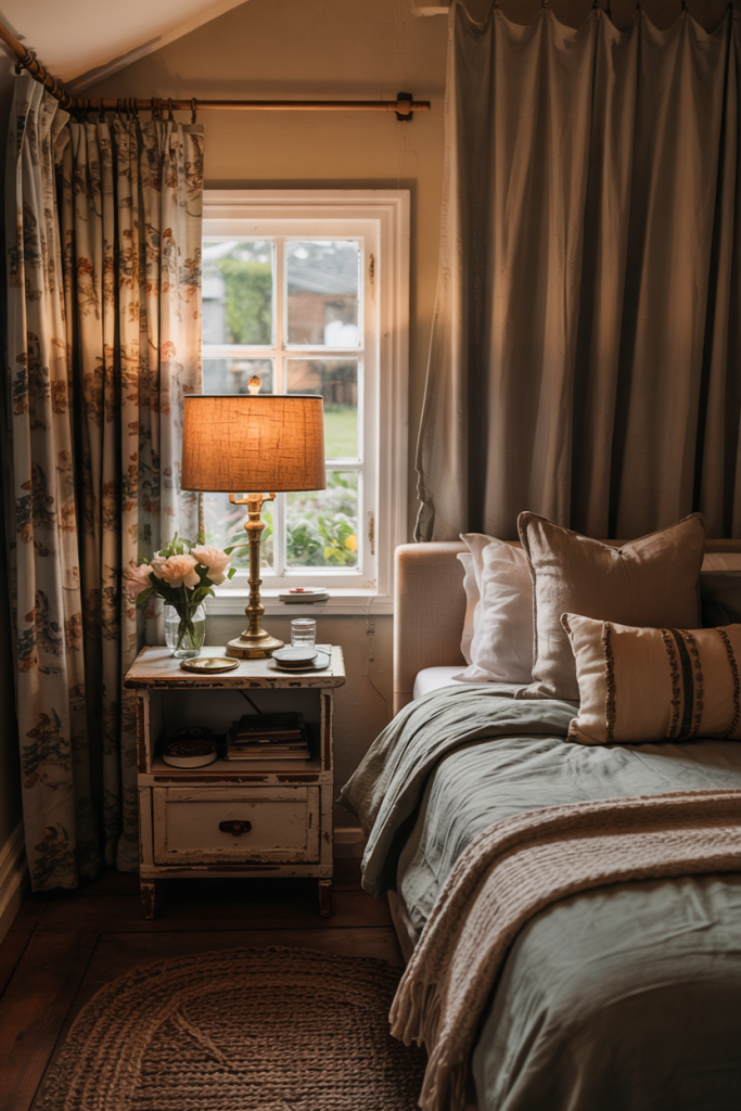 A blend of cozy warmth and rich tones creates a welcoming hideaway. Touches of rustic wood, a deep blue throw, and gentle cozy accents shape the mood. Even in a small room, these elements work beautifully when balanced with light textiles and soft lighting.