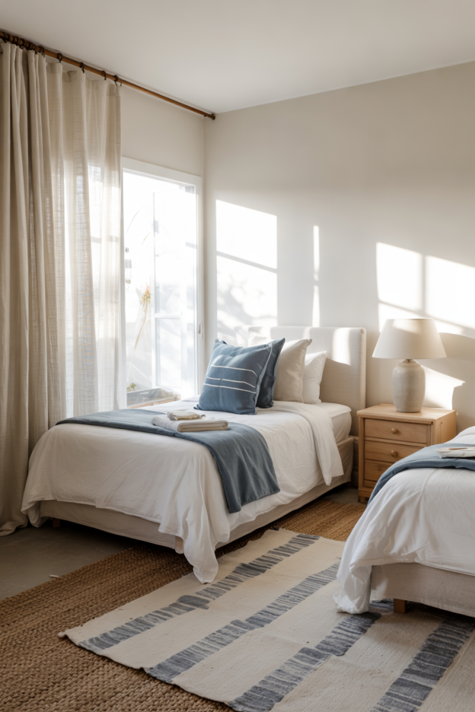 For homes by the shore, combining a soft coastal palette with breezy neutral tones keeps the room light. Matching twin beds create symmetry that works well in tighter layouts. Add subtle cozy textures like linen pillows to keep everything crisp but comfortable.