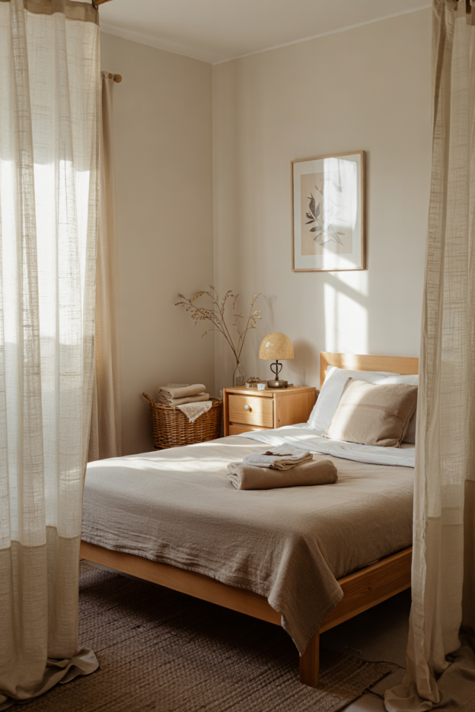 When space is tight, a small room thrives with soft minimalism. Clean lines and a refined palette using cozy, modern, simple textures help ground the space. Adding a gentle blue throw or subtle neutral accents keeps the design light while preserving a modern, uncluttered feel.