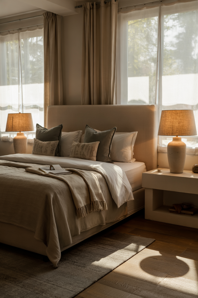 A spacious guest room becomes a true retreat when styled with soft layers and comfortable touches. Using large furniture pieces like an upholstered bed and wide nightstands adds structure. A muted, relaxing palette, combined with hints of grey and subtle, cozy modern flair, keeps everything grounded.