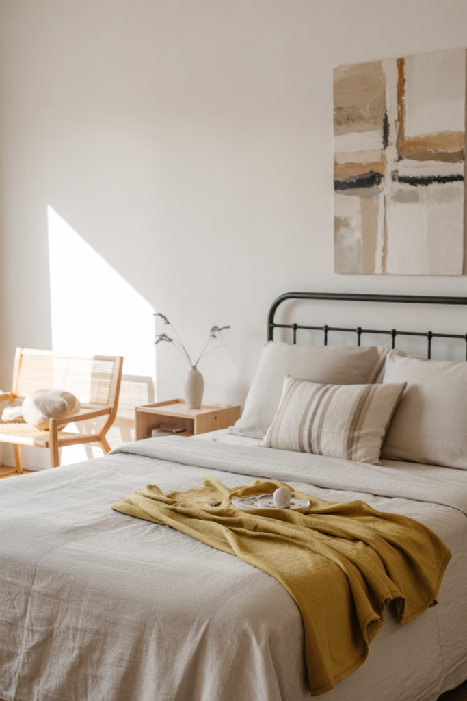 Scandi-inspired design feels timeless, especially when paired with a sleek black bed frame that creates contrast. Layering neutral textures and a touch of soft green warms the palette. A bit of cozy texture, like a chunky throw, helps the room feel intentionally serene.