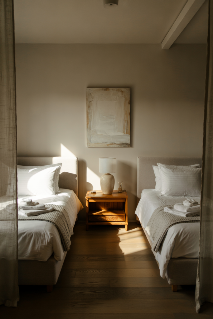 Pairing two twin beds instantly adds structure and versatility to a guest layout. Soft neutral bedding keeps everything calm, while hints of cozy modern texture lift the look. A subtle grey throw or patterned pillow adds personality without overwhelming the room.
