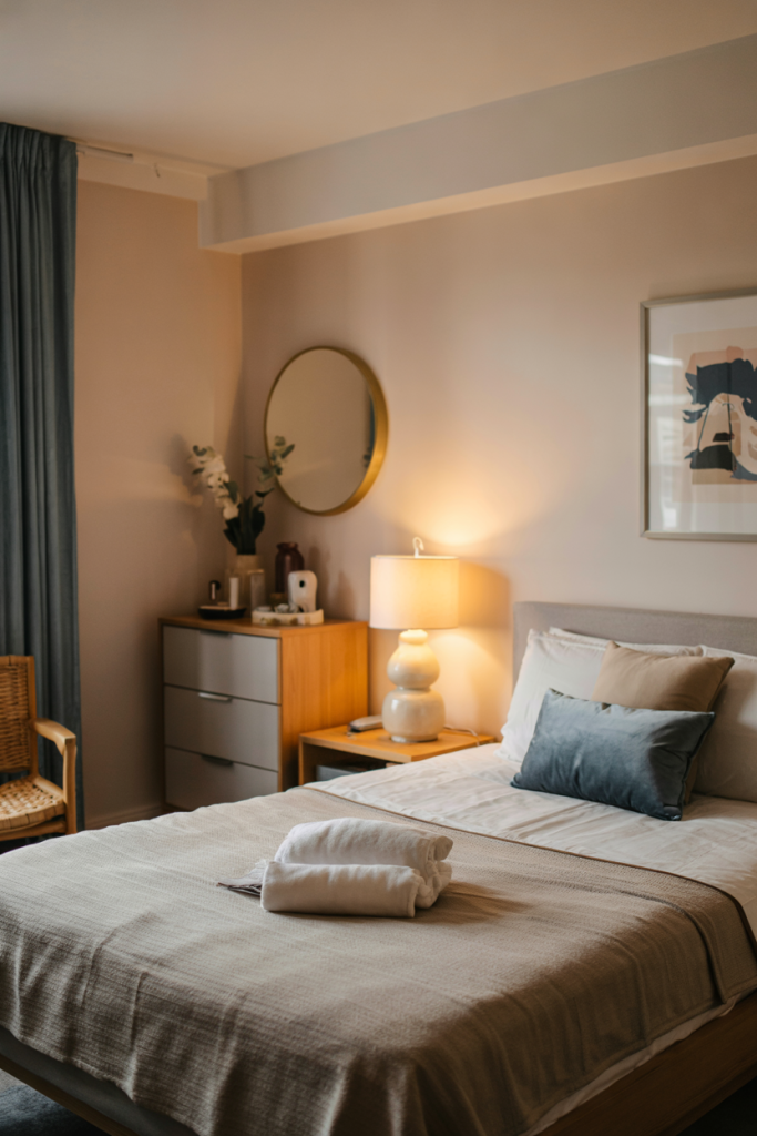 Apartment guest rooms benefit from a light, refined palette built around cozy, modern, elegant textures. Soft lighting and streamlined décor set the tone, while a muted blue accent or gentle neutral bedding keeps the mood calm. Even in tight spaces, a few tiny accents elevate the look.