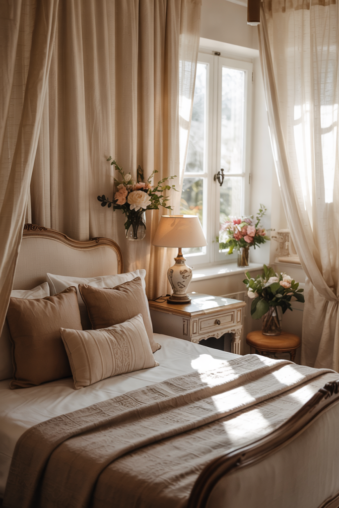 Add charm with soft curves and antique textures inspired by cozy French country vibes. A carved headboard, linen bedding, and touches of brown make the space feel storied. Meanwhile, hints of cozy, modern, elegant styling ensure it stays fresh. Even a large room can feel warm with layered textiles.
