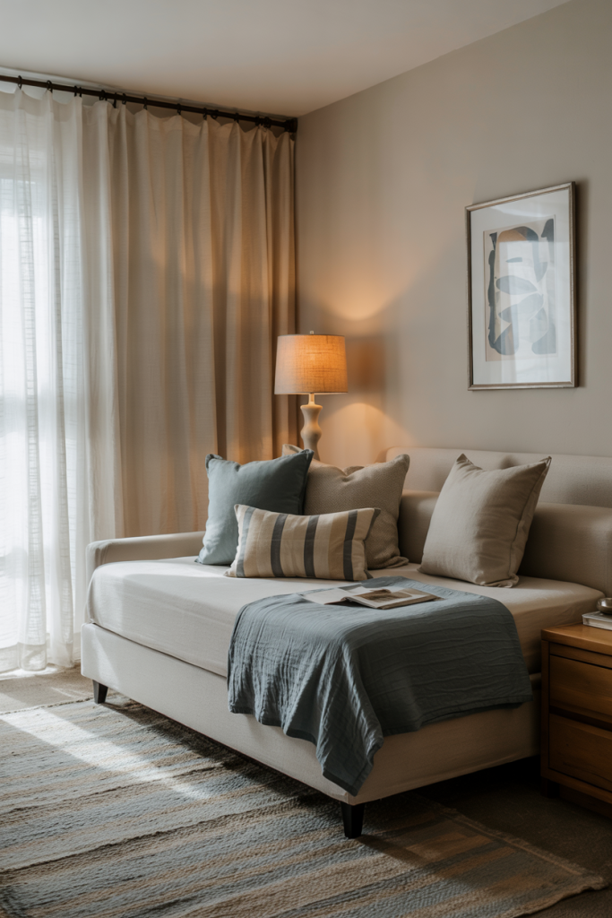 A gentle palette makes any guest room feel instantly inviting, especially when you play with soft tones like powder blue and subtle neutral accents. A slim-profile daybed keeps the layout flexible, while layered textures create a serene, relaxing atmosphere without overwhelming a small footprint.