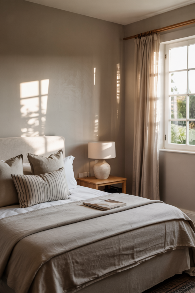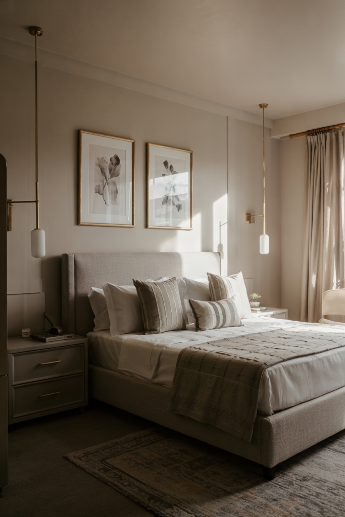 A spacious guest room becomes a true retreat when styled with soft layers and comfortable touches. Using large furniture pieces like an upholstered bed and wide nightstands adds structure. A muted, relaxing palette, combined with hints of grey and subtle, cozy modern flair, keeps everything grounded.