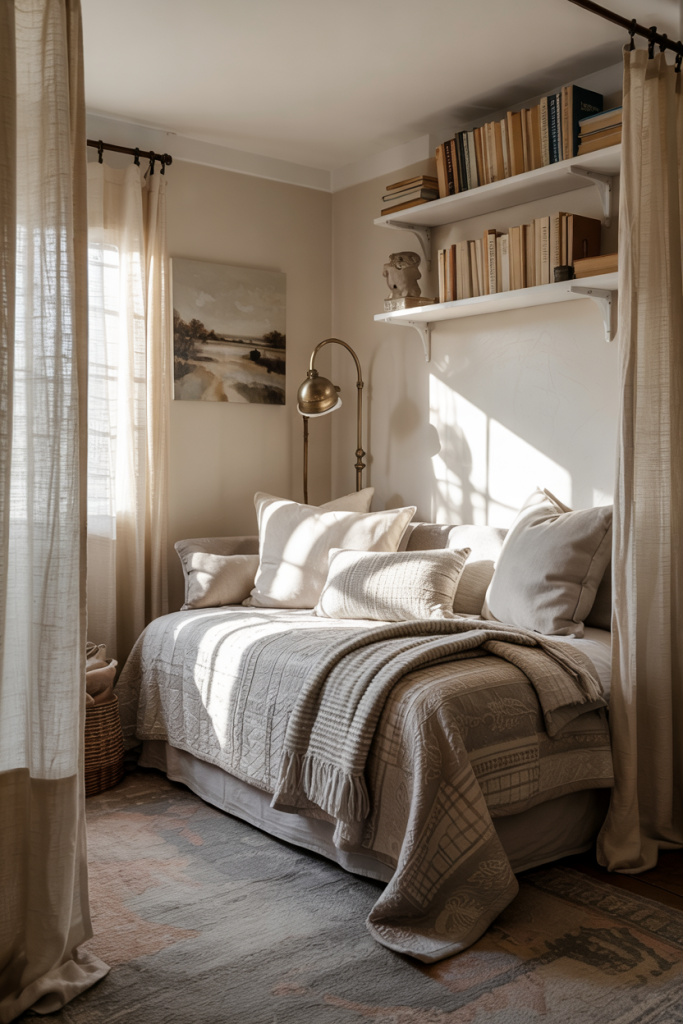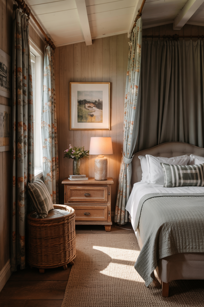 A blend of cozy warmth and rich tones creates a welcoming hideaway. Touches of rustic wood, a deep blue throw, and gentle cozy accents shape the mood. Even in a small room, these elements work beautifully when balanced with light textiles and soft lighting.