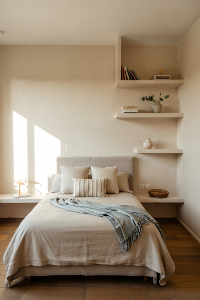When space is tight, a small room thrives with soft minimalism. Clean lines and a refined palette using cozy, modern, simple textures help ground the space. Adding a gentle blue throw or subtle neutral accents keeps the design light while preserving a modern, uncluttered feel.