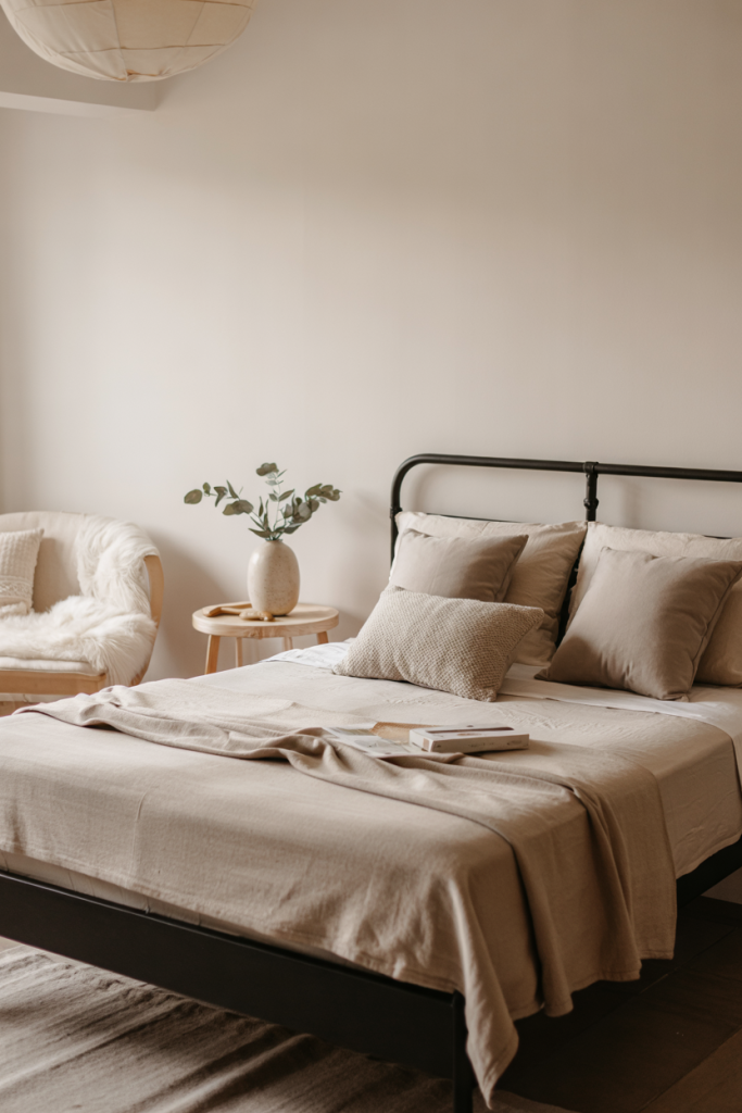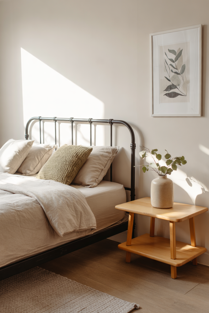 Scandi-inspired design feels timeless, especially when paired with a sleek black bed frame that creates contrast. Layering neutral textures and a touch of soft green warms the palette. A bit of cozy texture, like a chunky throw, helps the room feel intentionally serene.