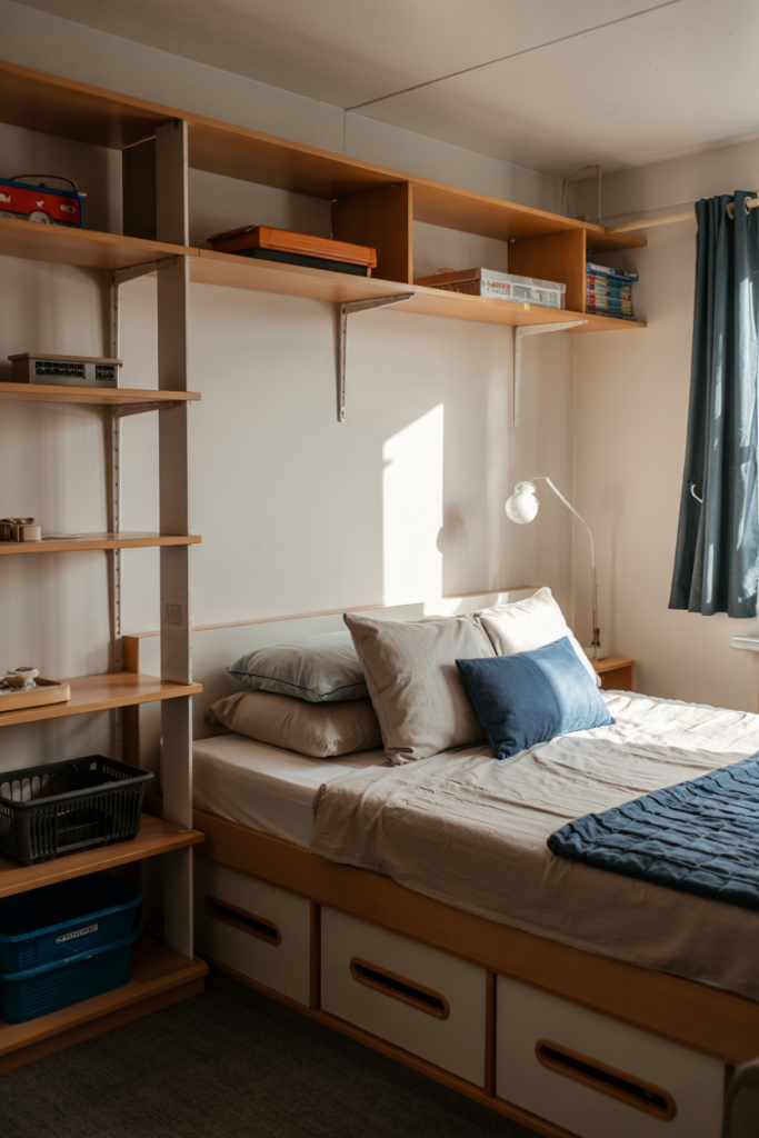 Make the most of small layouts with clever Ikea solutions that combine storage and comfort. Soft neutral tones keep the look airy, while small pops of blue or subtle cute décor add personality. Choose slim furniture to preserve walking space and keep the room feeling open.
