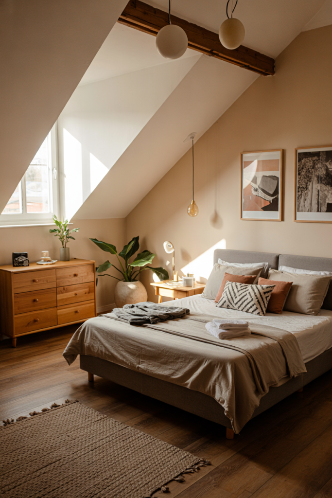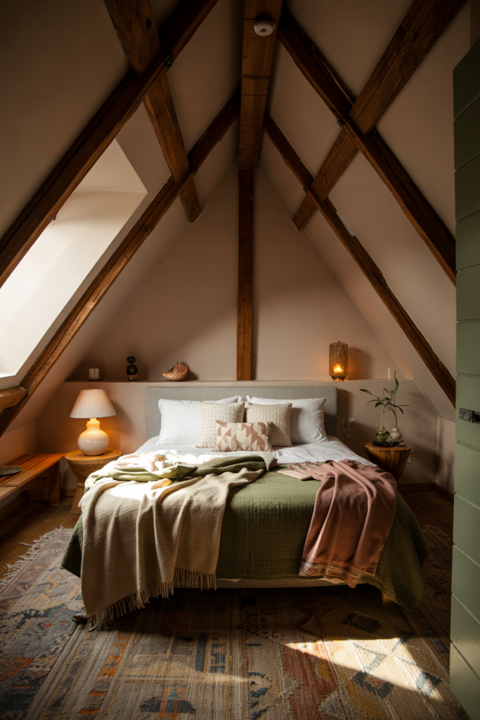 Turn attic corners into warm hideaways by introducing earthy details and muted tones like green and natural woods. A charming blend of rustic surfaces and a compact layout keeps the space intimate. Adding a simple woven throw and a cute lamp can make even a tucked-away spot feel surprisingly cozy.