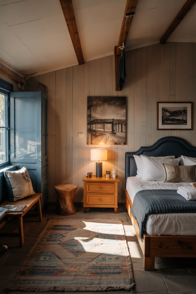 Where it works best: cabins, mountain homes, and suburban houses looking for a guest room that feels grounded and warm. The rustic-blue combo feels both stylish and familiar, making visitors feel instantly comfortable.