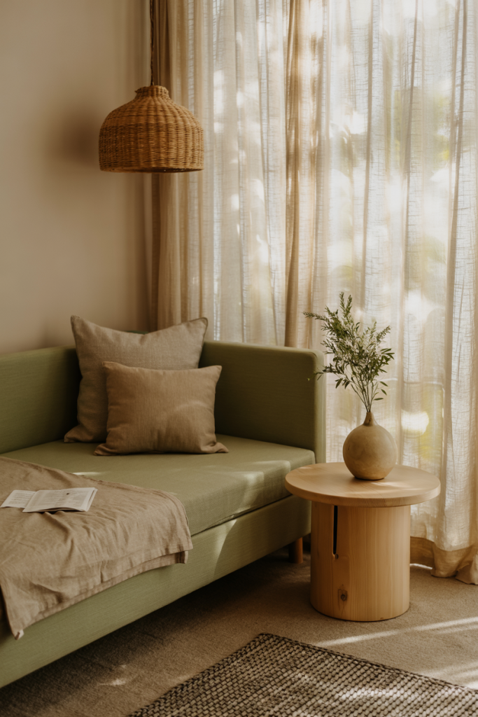 A calming palette built around muted green tones instantly creates a grounded atmosphere. Light wood furniture and a slim daybed help the space feel airy, while soft throws introduce a relaxing touch. A few cozy layers complete the feeling of an inviting, restorative corner.