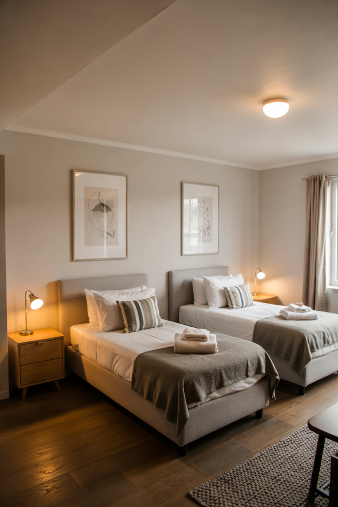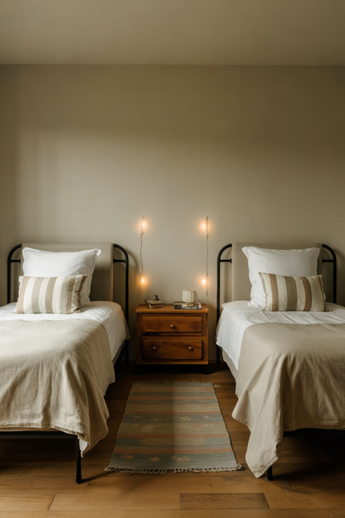 Pairing two twin beds instantly adds structure and versatility to a guest layout. Soft neutral bedding keeps everything calm, while hints of cozy modern texture lift the look. A subtle grey throw or patterned pillow adds personality without overwhelming the room.