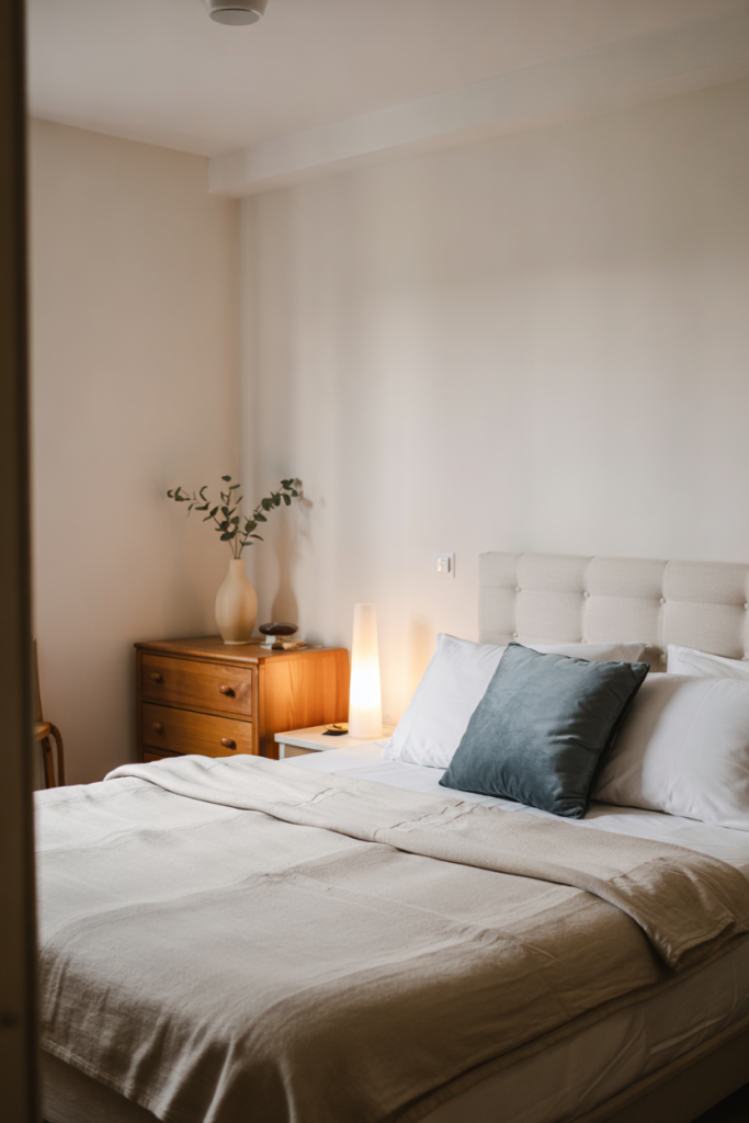 Apartment guest rooms benefit from a light, refined palette built around cozy, modern, elegant textures. Soft lighting and streamlined décor set the tone, while a muted blue accent or gentle neutral bedding keeps the mood calm. Even in tight spaces, a few tiny accents elevate the look.