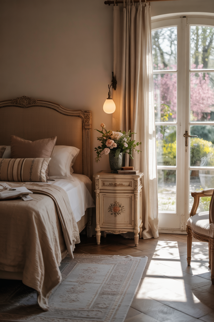 Add charm with soft curves and antique textures inspired by cozy French country vibes. A carved headboard, linen bedding, and touches of brown make the space feel storied. Meanwhile, hints of cozy, modern, elegant styling ensure it stays fresh. Even a large room can feel warm with layered textiles.