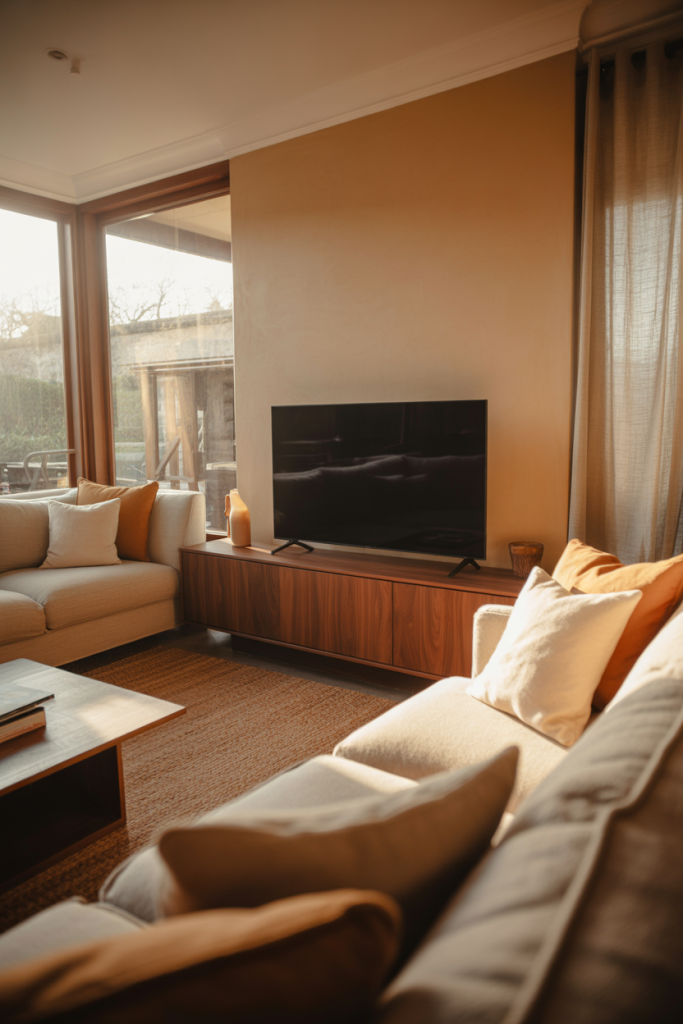 A Bohemian TV wall enjoys variety, especially with warm, layered materials, such as plaster, wood, and soft fabrics. It makes the wall feel cozy and expressive, with the TV as part of a relaxed arrangement rather than the main focus.