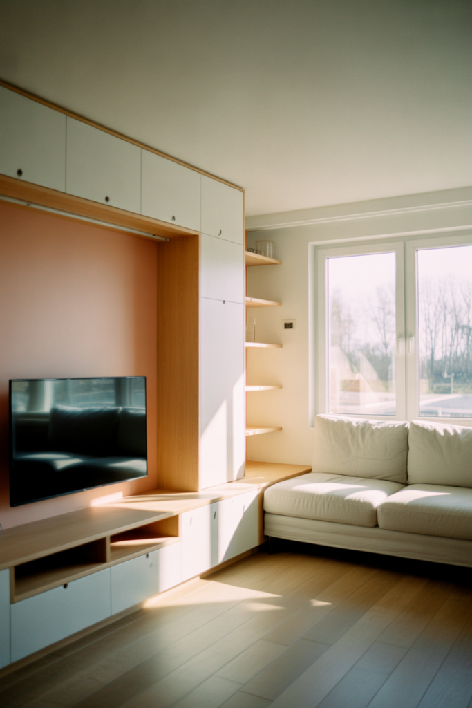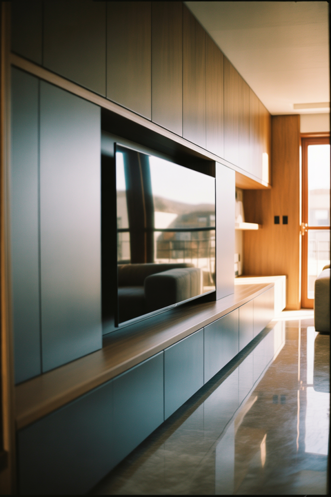 A Scandinavian TV wall focuses on light, simplicity, and function. Pale woods, soft whites, and a Floating media console create an airy look that feels relaxed but intentional. The result is Cozy without visual heaviness, ideal for smaller apartments or family spaces.