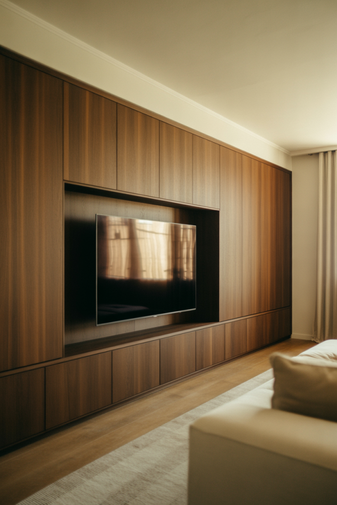 A truly Minimal TV wall hides more than it shows. Flat cabinetry, push-latch doors, and hidden compartments create a seamless surface where the screen quietly blends in. The design feels calm, modern, and highly intentional.