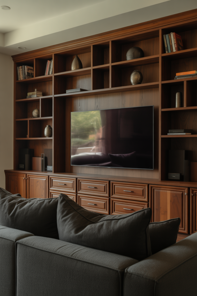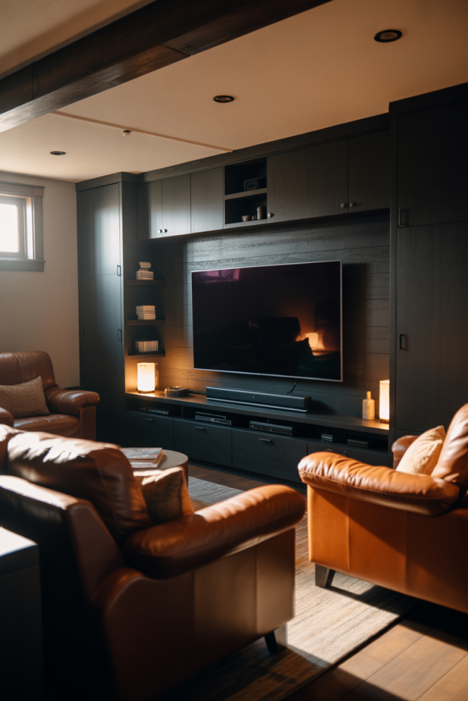 A TV wall in the basement gets structure from built-in furniture. Cabinet and shelving units add organization and purpose, and the style can be a bit darker without feeling heavy, creating a cozy viewing atmosphere.