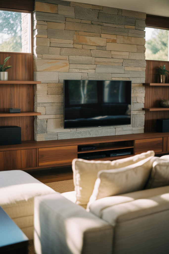 A Rustic TV wall with stone brings texture and permanence. The natural surface softens the screen’s presence while adding character. Paired with simple furniture, the wall feels grounded and timeless.