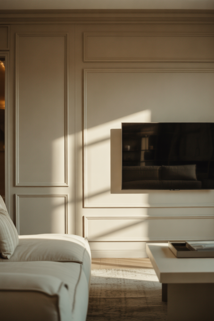 This TV wall uses subtle panel framing to create an Elegant backdrop without heavy ornament. The structure feels refined yet calm, allowing the screen to sit comfortably within a composed surface. Light tones and gentle shadows keep the design visually quiet, making it ideal for formal living rooms that still need to feel welcoming.