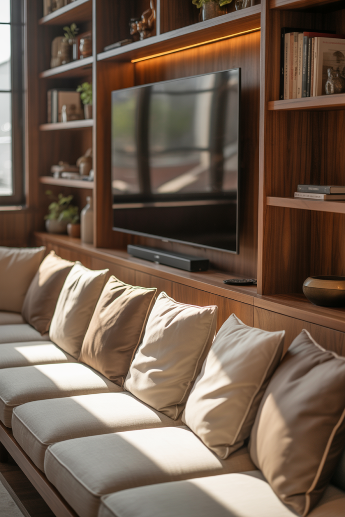 A practical insight here is to limit shelf depth. Shallow shelves prevent visual clutter and keep the TV wall from feeling bulky. Many designers recommend no deeper than eight inches, which still allows styling without stealing square footage from the room.