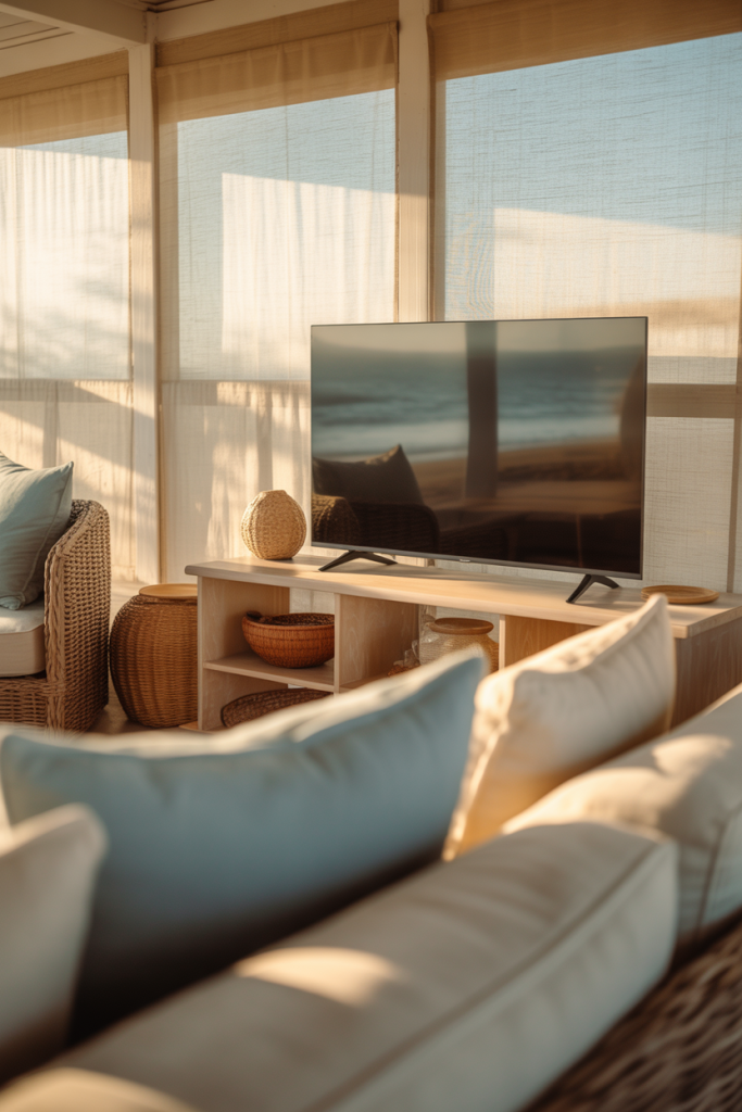 This approach works best in homes with plenty of natural light. Large windows amplify the coastal feel, making the TV wall blend seamlessly into the overall atmosphere.
