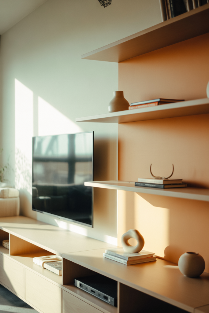This idea leans into a Minimal aesthetic without feeling cold. A clean TV wall paired with Floating shelves creates breathing room while still offering a place for books and personal objects. The look feels Elegant and calm, perfect for open living rooms where the TV shouldn’t dominate. Neutral finishes and subtle textures keep the wall visually light.
