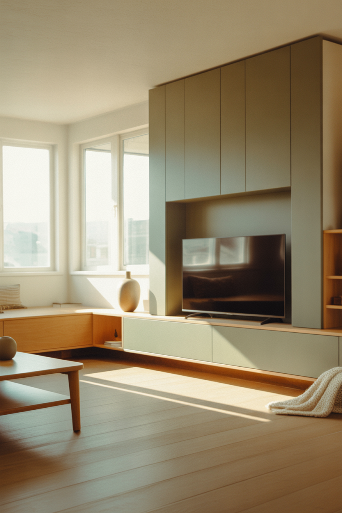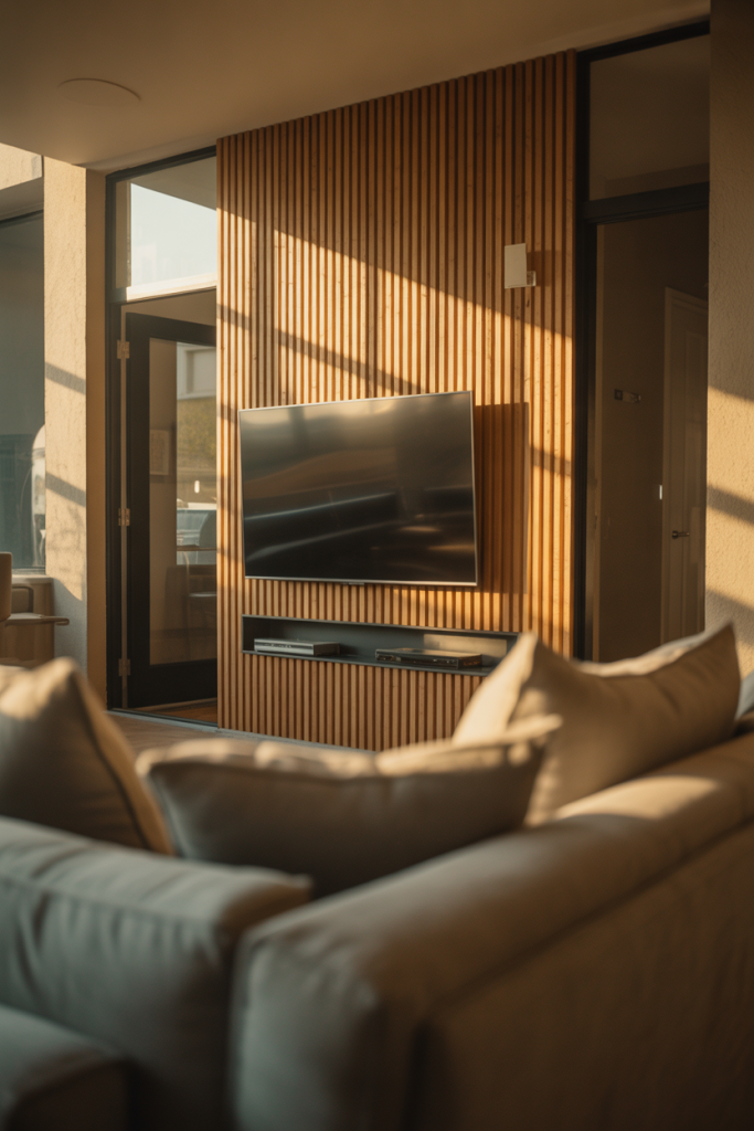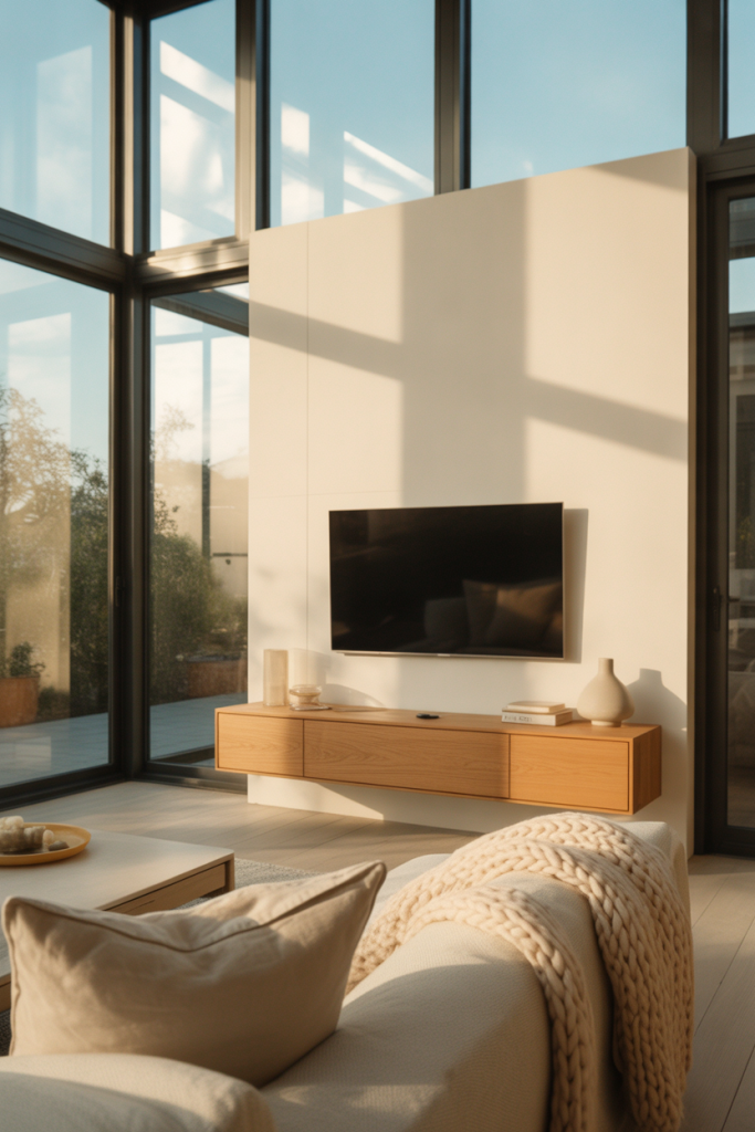 A Scandinavian TV wall focuses on light, simplicity, and function. Pale woods, soft whites, and a Floating media console create an airy look that feels relaxed but intentional. The result is Cozy without visual heaviness, ideal for smaller apartments or family spaces.