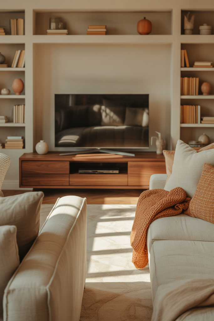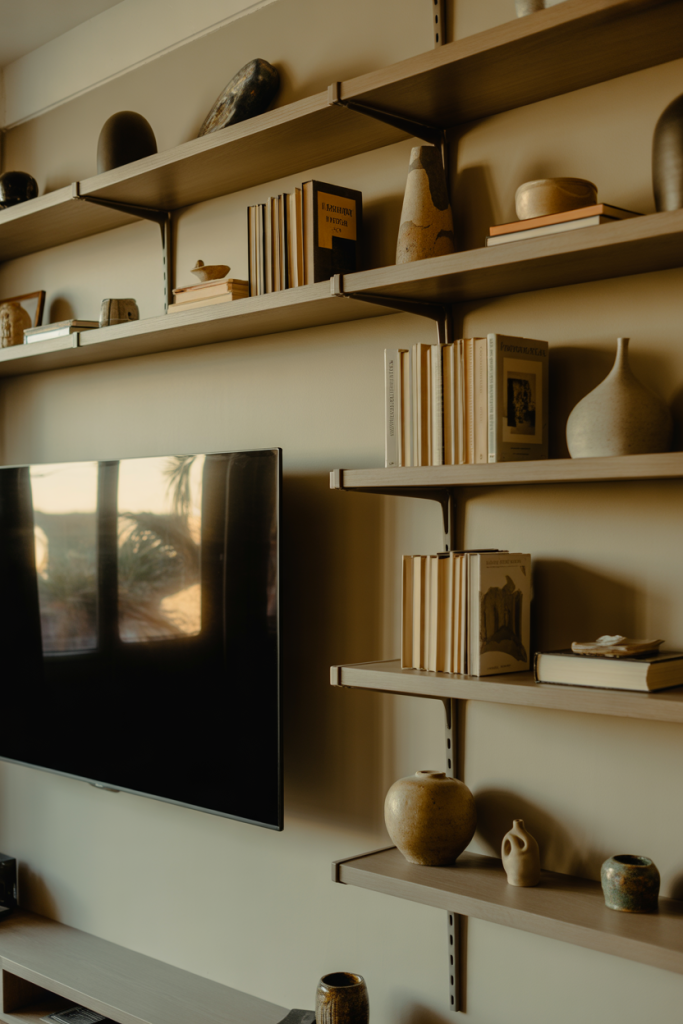 A practical insight here is to limit shelf depth. Shallow shelves prevent visual clutter and keep the TV wall from feeling bulky. Many designers recommend no deeper than eight inches, which still allows styling without stealing square footage from the room.