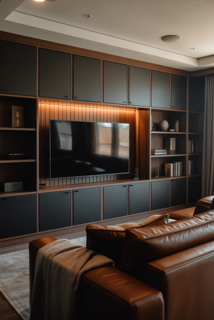 A TV wall in the basement gets structure from built-in furniture. Cabinet and shelving units add organization and purpose, and the style can be a bit darker without feeling heavy, creating a cozy viewing atmosphere.