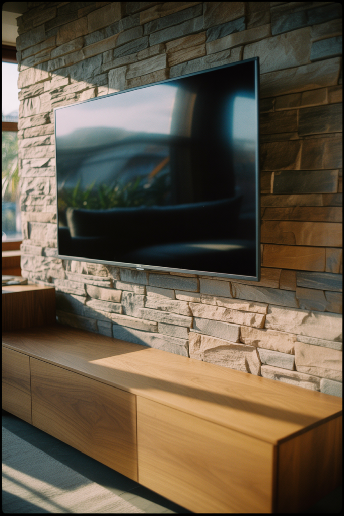 A Rustic TV wall with stone brings texture and permanence. The natural surface softens the screen’s presence while adding character. Paired with simple furniture, the wall feels grounded and timeless.