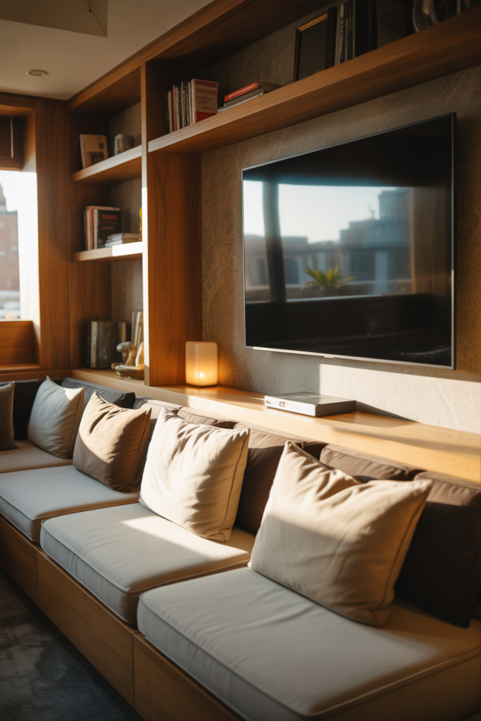 A Cozy TV wall paired with a small seating nook turns media time into a layered experience. Soft upholstery, shelving, and warm finishes make the wall feel inviting rather than technical. The TV becomes part of a lived-in zone designed for long evenings.