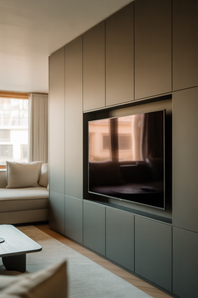 A truly Minimal TV wall hides more than it shows. Flat cabinetry, push-latch doors, and hidden compartments create a seamless surface where the screen quietly blends in. The design feels calm, modern, and highly intentional.