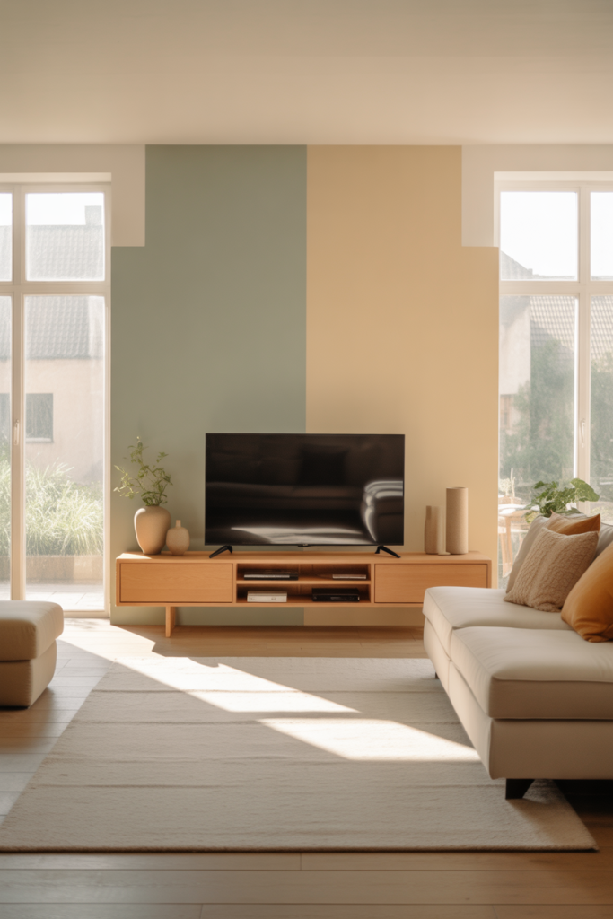 This Scandinavian media wall employs gentle color blocking to delineate the media zone, adding bulk to the design. Soft, muted tones behind the TV divide the media zone from the rest of the space, adding subtle warmth, dividers, and an understated design from the rest of the space.
