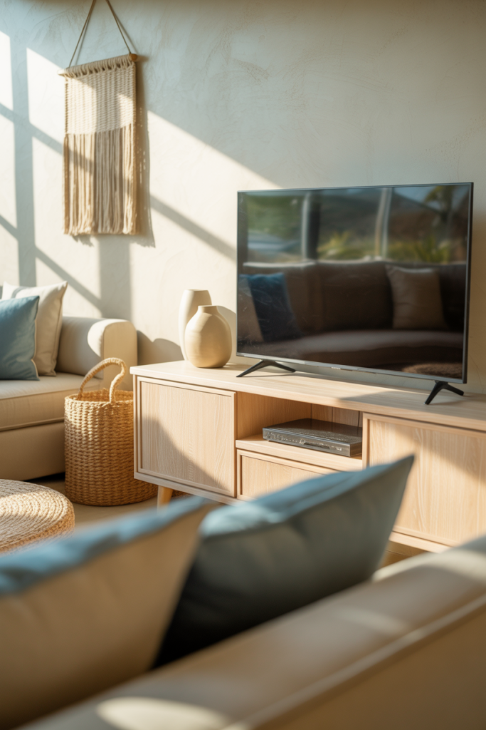 A Coastal TV wall brings softness and ease into the home. Light woods, woven accents, and pale walls create a relaxed mood that feels breezy but refined. The design stays Elegant while remaining approachable, perfect for family rooms or vacation-inspired interiors.