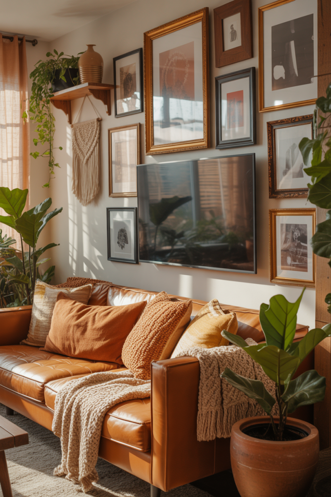 A Bohemian TV wall enjoys variety, especially with warm, layered materials, such as plaster, wood, and soft fabrics. It makes the wall feel cozy and expressive, with the TV as part of a relaxed arrangement rather than the main focus.