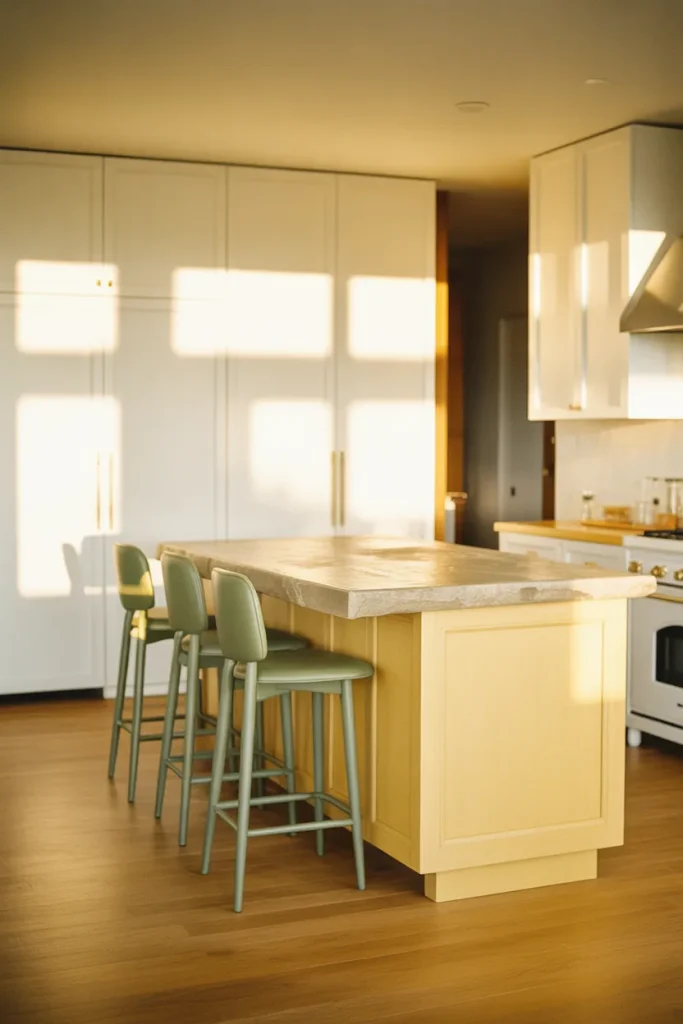 A Pale yellow Island becomes the heart of the kitchen when styled with subtle Green and botanical touches. This combination feels organic and calm, ideal for families who spend long hours cooking and gathering. The color reads fresh rather than flashy.