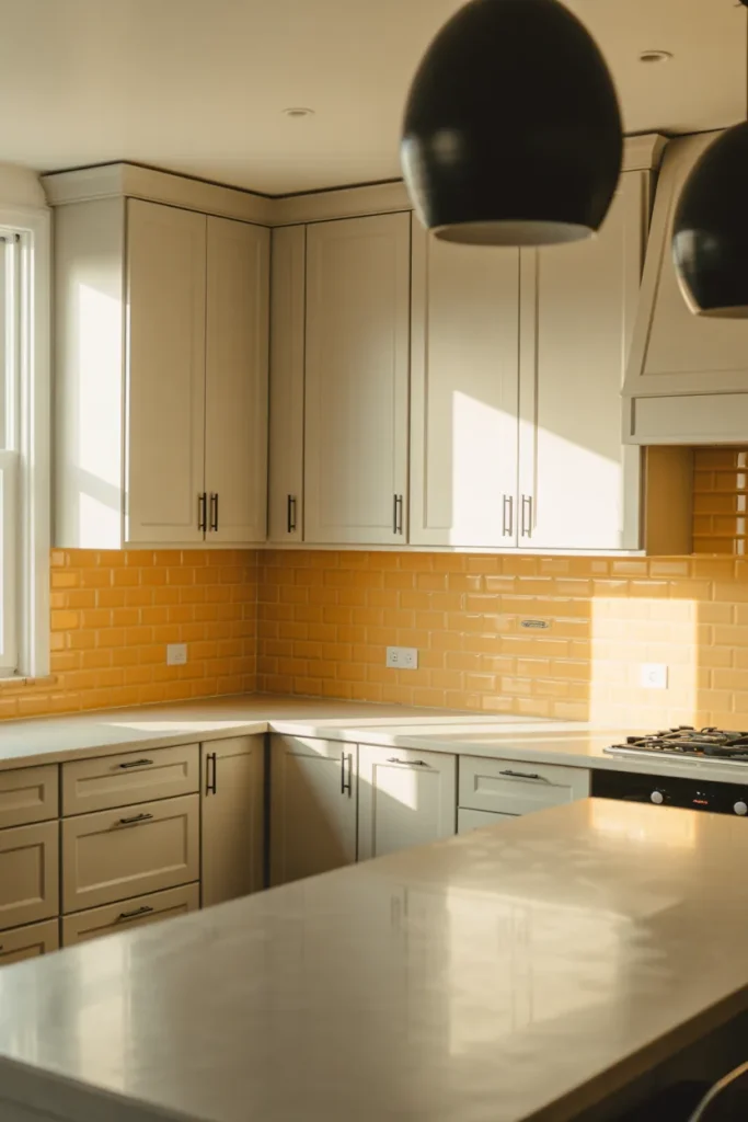 A bold Mustard Backsplash against clean White and Cabinets creates immediate impact without covering every surface in color. This approach is ideal for those who prefer restraint but still want a statement moment near the stove or sink.