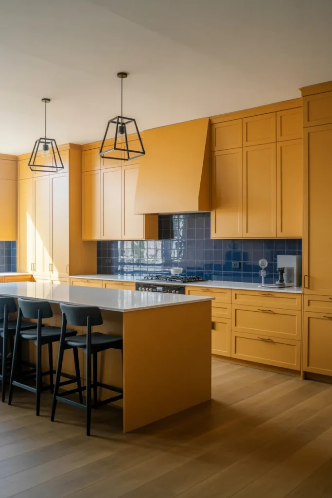 A bold Mustard foundation paired with crisp Blue and accents creates graphic Designs that feel modern and confident. This color mix works beautifully with streamlined cabinetry and simple silhouettes. The contrast energizes open layouts and keeps the eye moving without overwhelming the space.