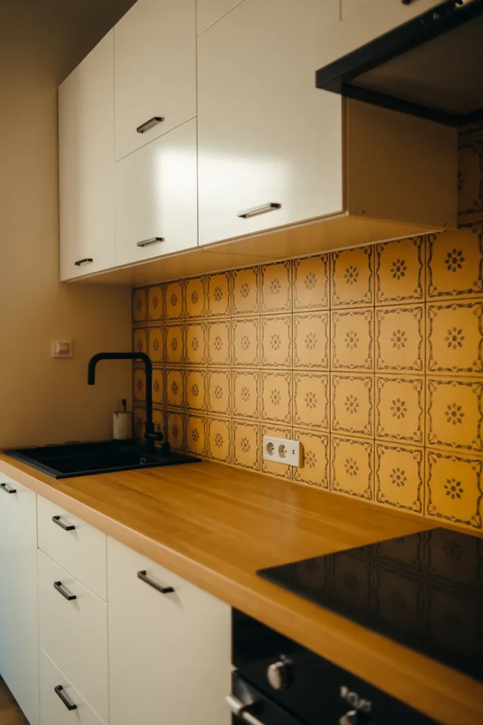 There’s something irresistible about Vintage charm, especially when expressed through patterned Tiles and a character-filled Backsplash. Yellow paired with subtle geometric motifs gives the space history without making it feel dated. It’s a nod to mid-century kitchens, updated with cleaner lines.