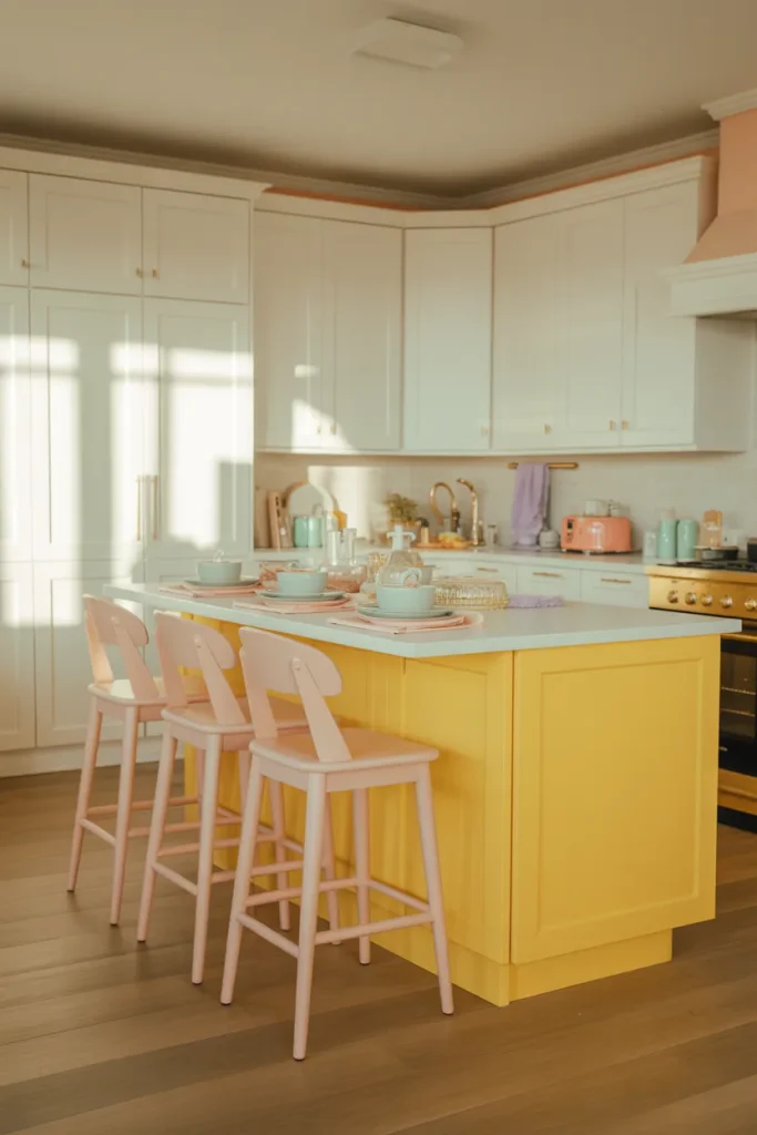 A central Island in buttery yellow surrounded by subtle Pink and Pastel accents creates a playful yet polished vibe. This combination feels youthful but not childish, especially when grounded with natural textures and understated lighting.