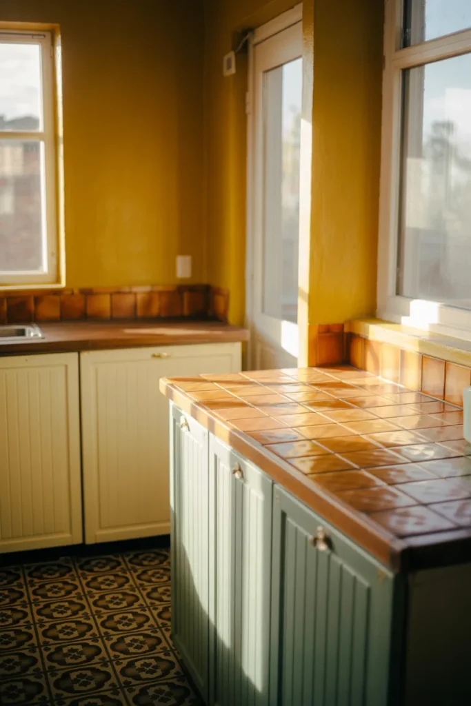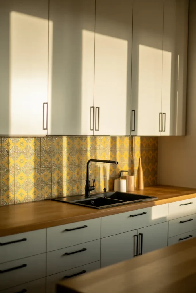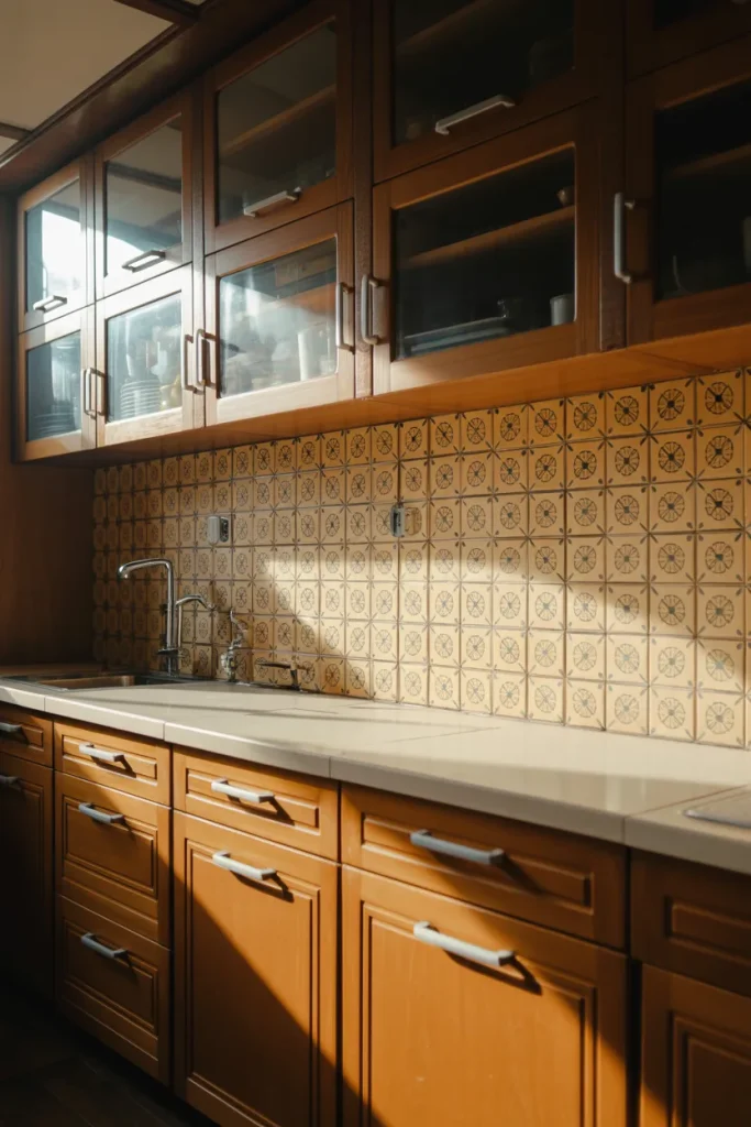 There’s something irresistible about Vintage charm, especially when expressed through patterned Tiles and a character-filled Backsplash. Yellow paired with subtle geometric motifs gives the space history without making it feel dated. It’s a nod to mid-century kitchens, updated with cleaner lines.