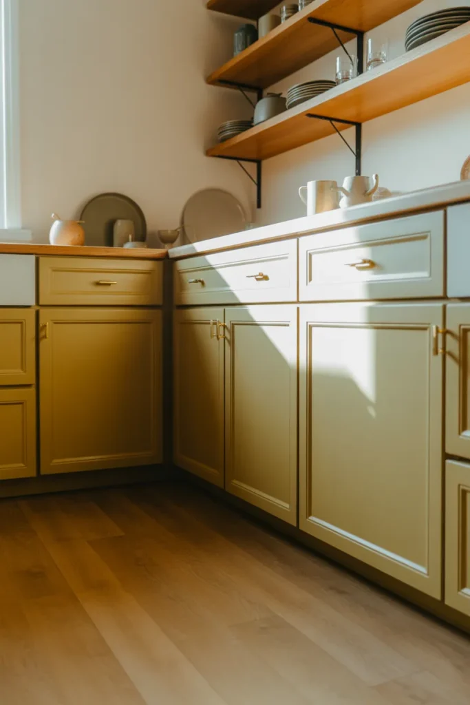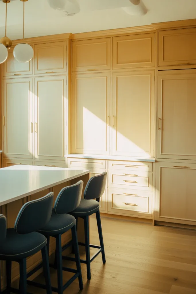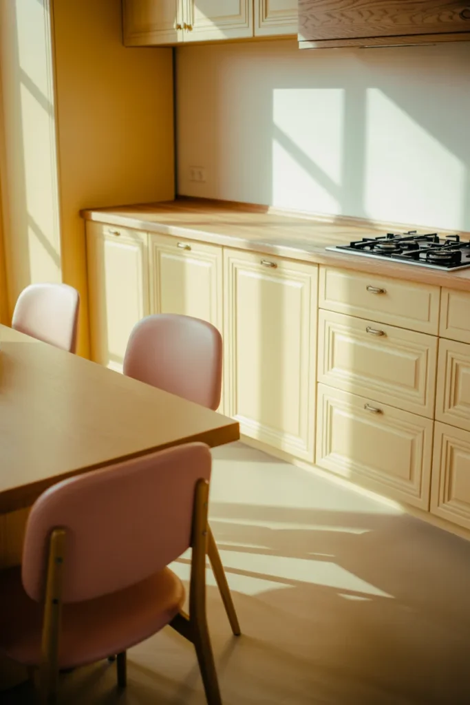 To make this palette truly shine, keep surrounding finishes quiet—matte counters and simple flooring allow the color to breathe. Designers often suggest layering slightly varied tones of cream rather than one flat shade. The result feels intentional and elevated, not sugary, and it keeps the kitchen timeless rather than trendy.