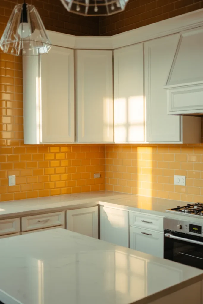 A bold Mustard Backsplash against clean White and Cabinets creates immediate impact without covering every surface in color. This approach is ideal for those who prefer restraint but still want a statement moment near the stove or sink.