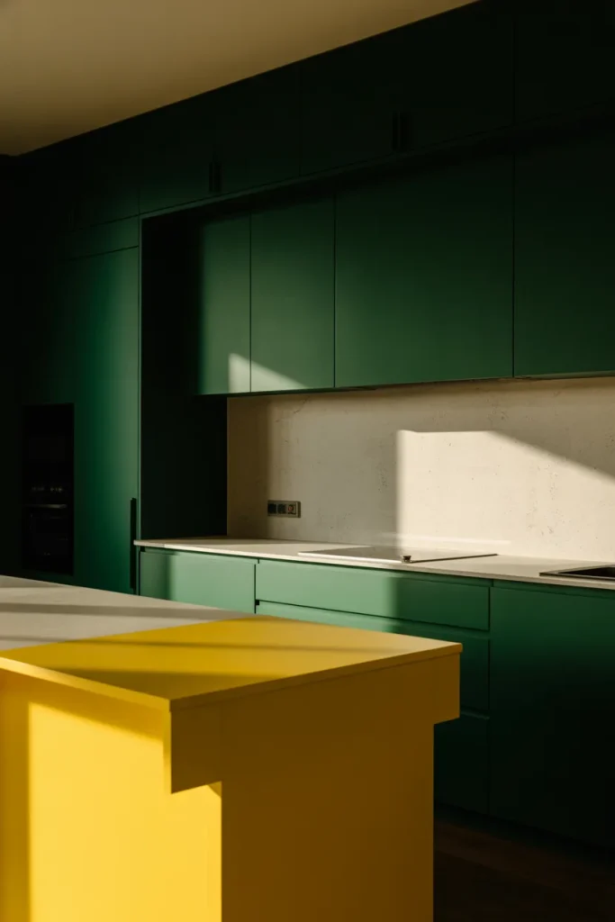 Contemporary Designs often embrace contrast, and pairing Green and yellow around a sculptural Island creates a bold focal point. When executed thoughtfully, the palette feels fresh and architectural rather than whimsical.