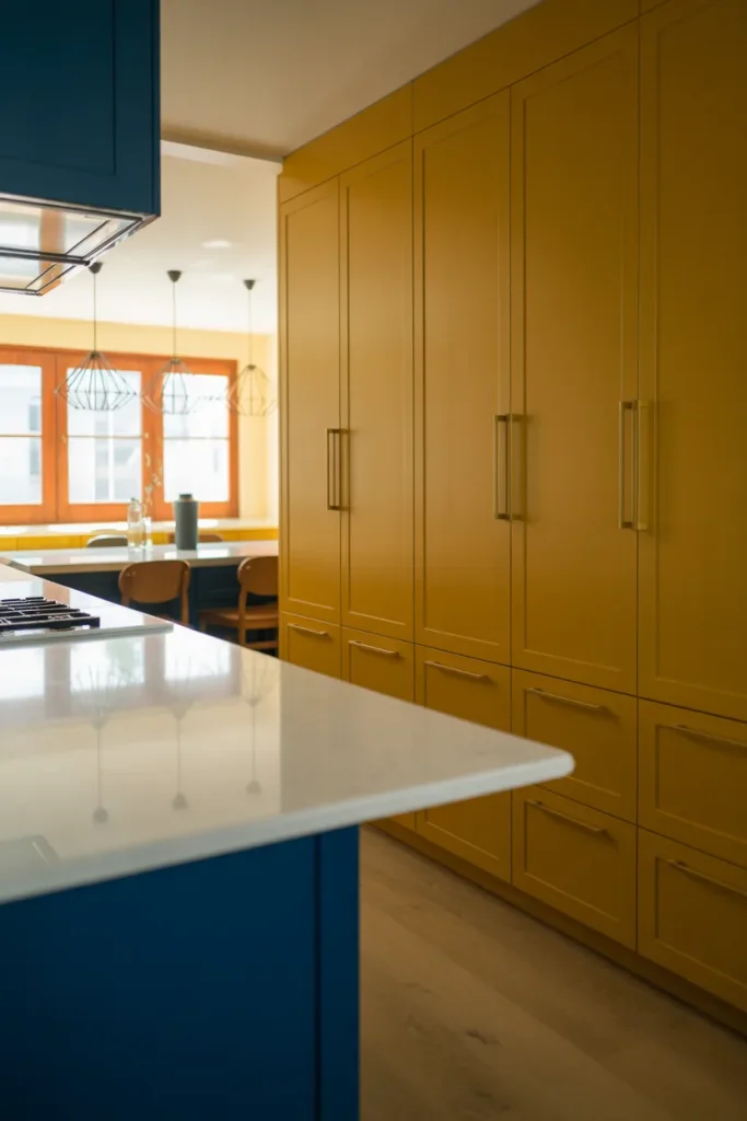 In coastal states like Florida and the Carolinas, this palette feels especially natural because it echoes sunshine and ocean tones. The key is restraint: limit blue to accents like stools or lighting, allowing yellow to remain the primary mood-setter without competition.