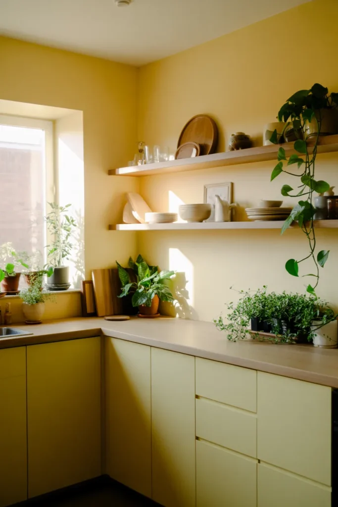 Painting the Walls a gentle Pale yellow and layering Green and botanical Decor creates a kitchen that feels calm and grounded. The combination reads fresh and organic, especially when paired with light wood and open shelving.