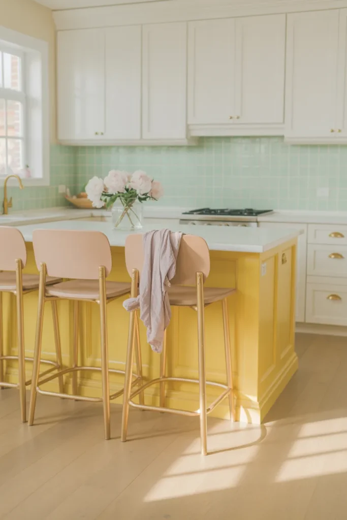 A central Island in buttery yellow surrounded by subtle Pink and Pastel accents creates a playful yet polished vibe. This combination feels youthful but not childish, especially when grounded with natural textures and understated lighting.